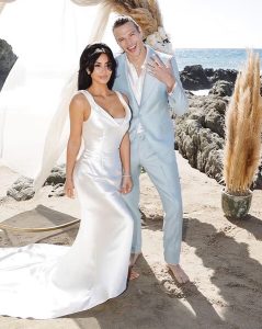На опубликованных фото она стоит у свадебной арки в Малибу в белом атласном платье с глубоким декольте и длинным шлейфом. Рядом — актёр Мэттью Ношка, сыгравший её экранного мужа.