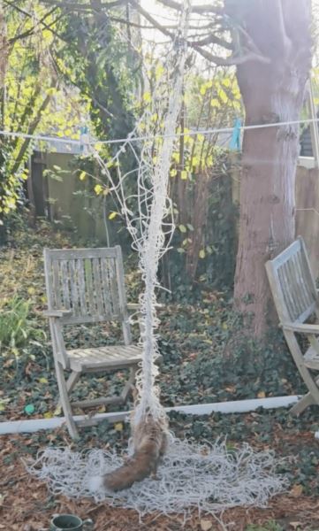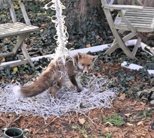 Любопытный зверёк наткнулся на футбольную сетку в одном из садов и решил исследовать сеть поближе. Результат оказался печален, хотя и ожидаем. Лиса запуталась, и ей только и оставалось, что поджидать помощь от инспекторов Королевского общества защиты животных.