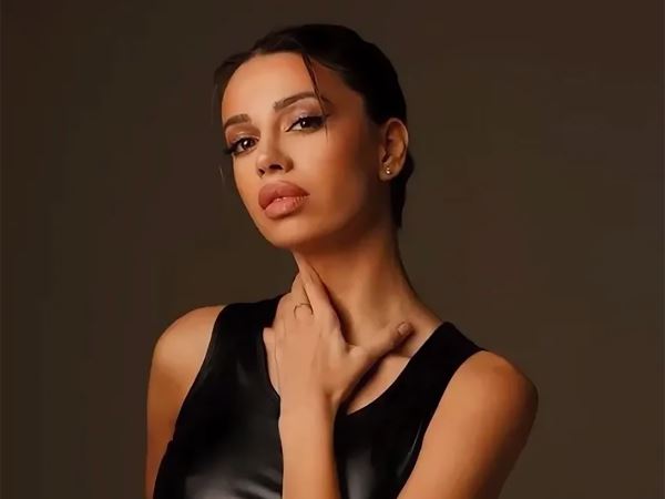 Российско-азербайджанская спортсменка и основательница сети студий растяжки и фитнеса позирует перед камерой в черном купальнике.