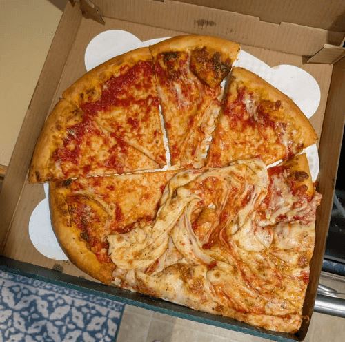 Но в данном случае гастрономическое злодеяние произошло не по вине слишком неумелых или чрезмерно эксцентричных кулинаров. Наверняка приготовленная пицца была неплоха, вот только к ней неуважительно отнеслись во время транспортировки. В результате сыр совершил с пиццы побег и наверняка удрал бы далеко, если бы не был ограничен коробкой.