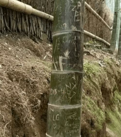 Находясь в живописном бамбуковом лесу Арасияма в Киото, мужчина поднял с земли камень и принялся этим инструментом царапать ствол бамбука. В результате турист оставил на память букву «М». Когда же незнакомцу сделали замечание, он искренне удивился и заявил, что и не подозревал о запрете выцарапывать надписи и символы на бамбуке.